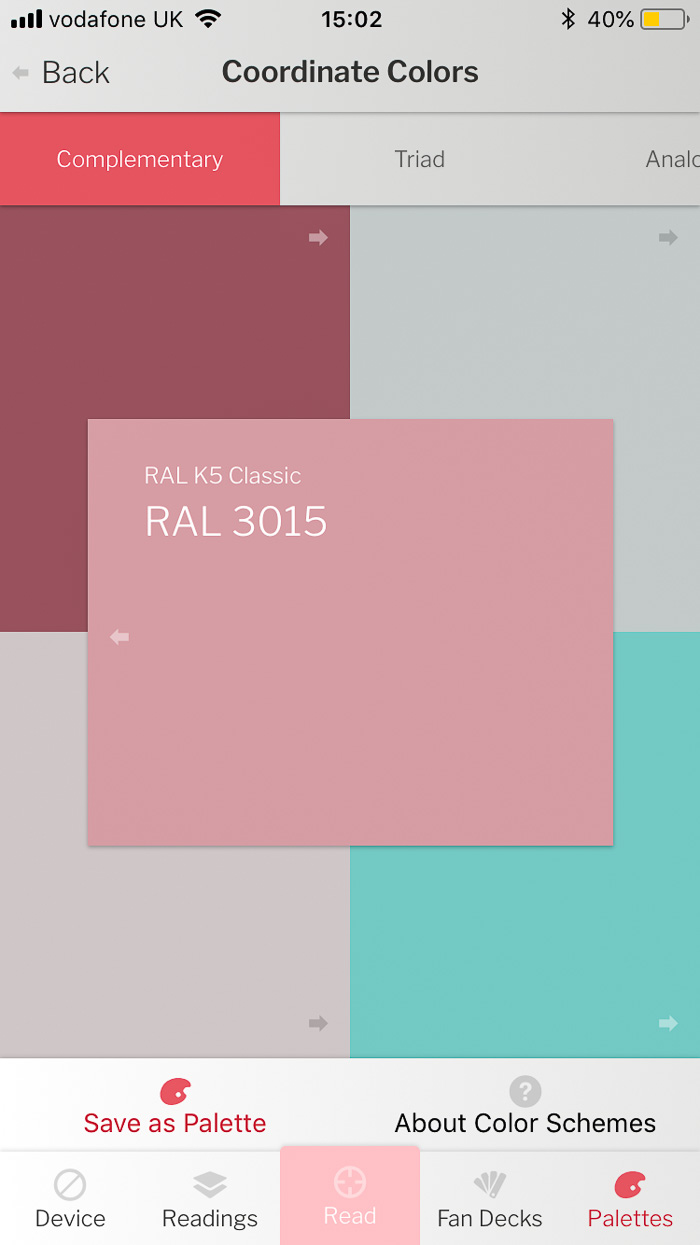 The ColorReader is small and portable, and it fits right into the palm of your hand. Simply download the mobile application, connect the device to your phone via Bluetooth, press calibrate and you are ready to go! It is easily used by holding the device against the colour you would like to match, and pressing “Read” on the app. The most accurate three paint shade matches will then appear with specifications of the colours, and the option to coordinate colours either complementary, triads, analogous or monochromatic.