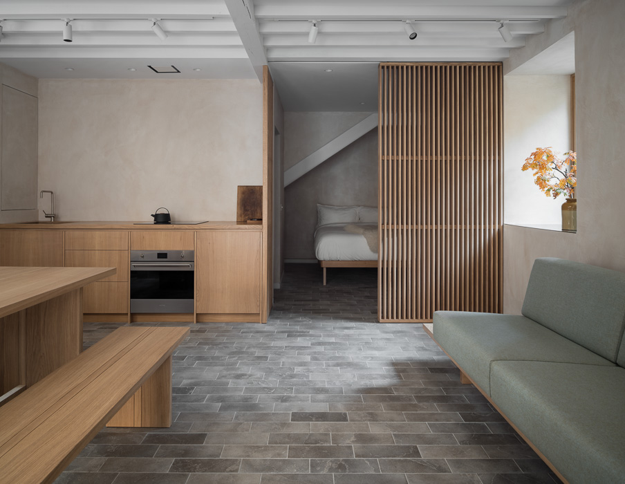 As for the furniture in this apartment, every piece has been produced from one single Oak Tree! Local cabinet-maker Namon Gaston, designed and manufactured the furniture with help from kitchen specialist Richard Anstice, and upholsterer Peter Jones. As stated on the studio’s website, the design has been so well thought-out that the “natural clay plaster walls regulate humidity levels to the optimum human comfort range creating a calm atmosphere, the velvet limestone tiles sit softly with the cobbles outside and the underfloor heating keeps feet cosy at all times”.